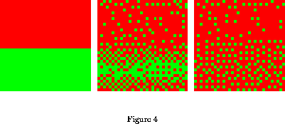 The dynamics of invasion of the grid by non-polluters differs according to the difference in prior utilities. For small differences (see figure 2), the invasion proceeds directly from the non-polluted region. For larger differences, spots of non polluting purchasers appear in the polluted regions, while the initially non polluted region is invaded by checkerboard patterns (see figure 3).