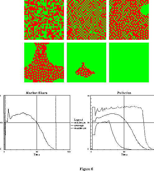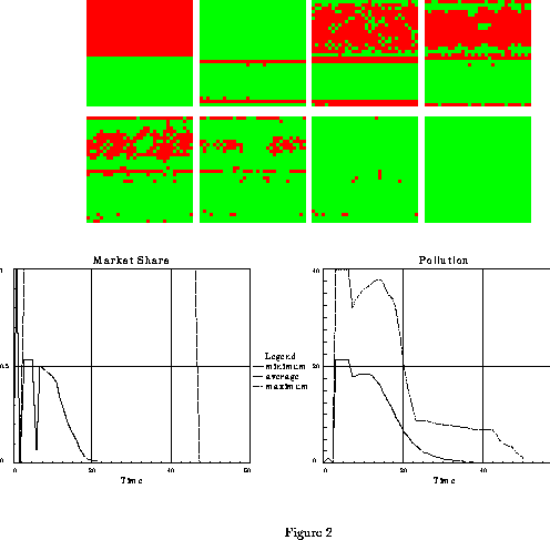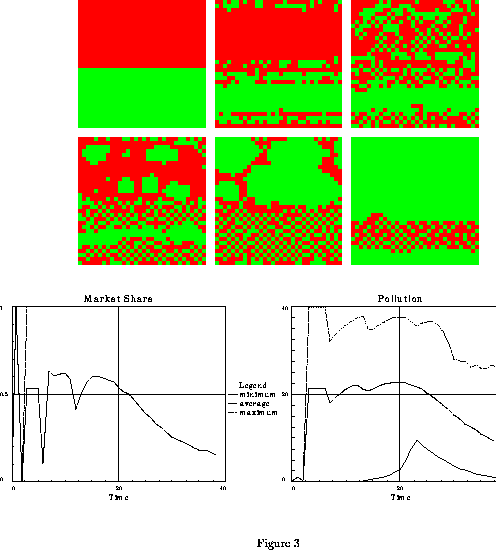 In the beginning of the simulation, when pollution builds up rapidly, a few period 2 oscillations of the market share in the region of polluting car buyers are observed (figures 2 and 3). This is because the agents only update the utility of the car bought in their neighborhood, while keeping the former utilities for the other brand. Since pollution is increasing, the former utilities always appear higher, which make the agents switch their choice at each time step. We called this effect the Don Juan effect in reference to the classical myth; Don Juan has high prior expectations about Woman, which makes him constantly change his female partners because none can meet his expectations.